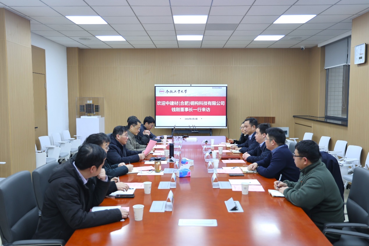 2026年2月3日,中建材(合肥)钢构科技有限公司钱刚董事长一行来黄色直播 交流。中建材(合肥)钢构科技有限公司董事长钱刚,副总经理蒋守锋,副总工程师董哲武等参加交流。黄色直播 院长王静峰,党委书记王东坡,副院长王昌建,相关系负责人和教师代表出席座谈。会议由王静峰院长主持。